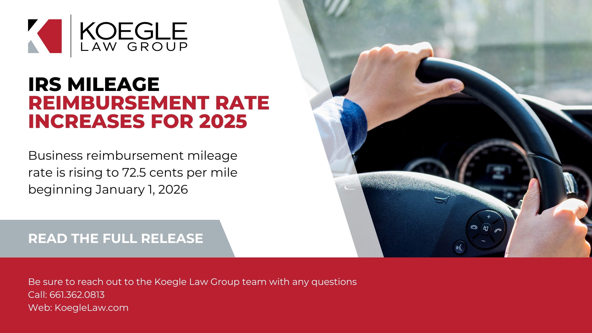 For more information on the status of the IRS business reimbursement mileage rate, and other pressing employment and business matters, please visit our website at https://www.koeglelaw.com/blogs/ or reach out to our office for more information.